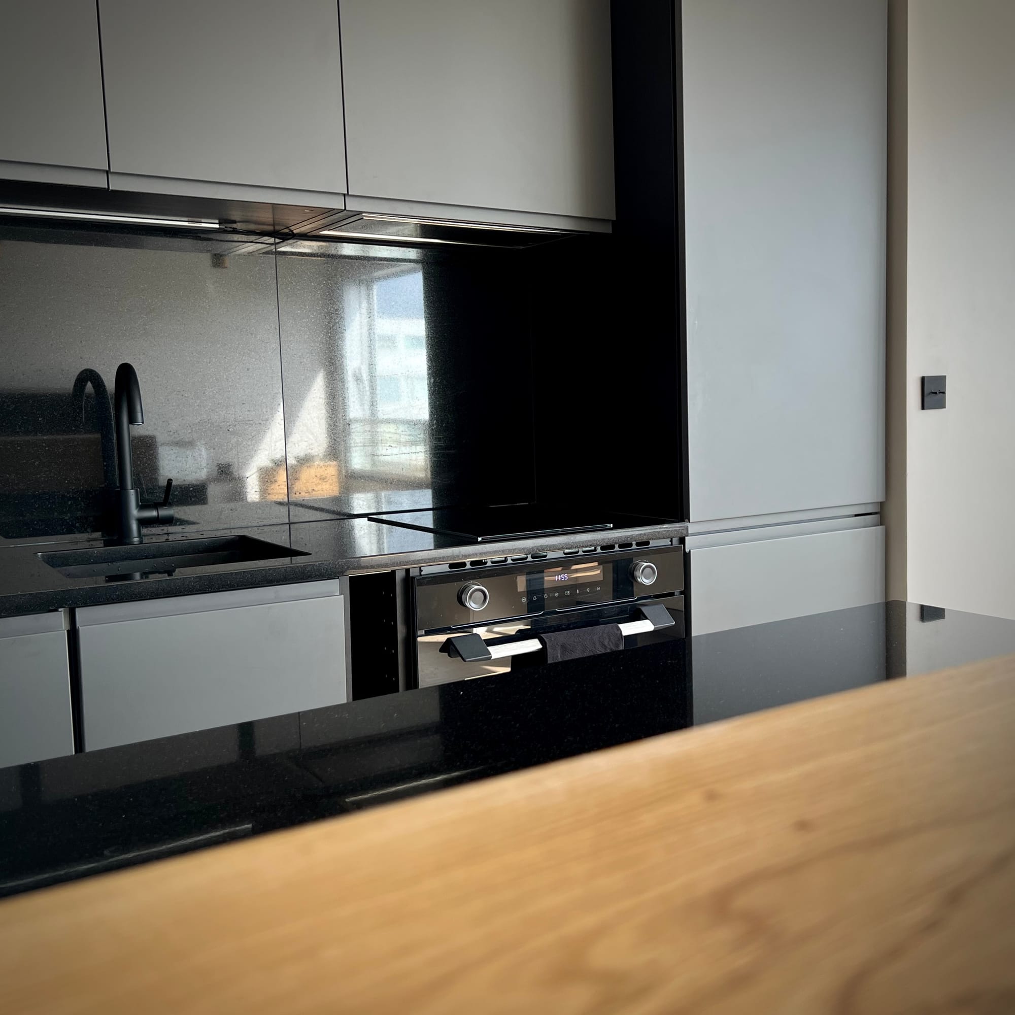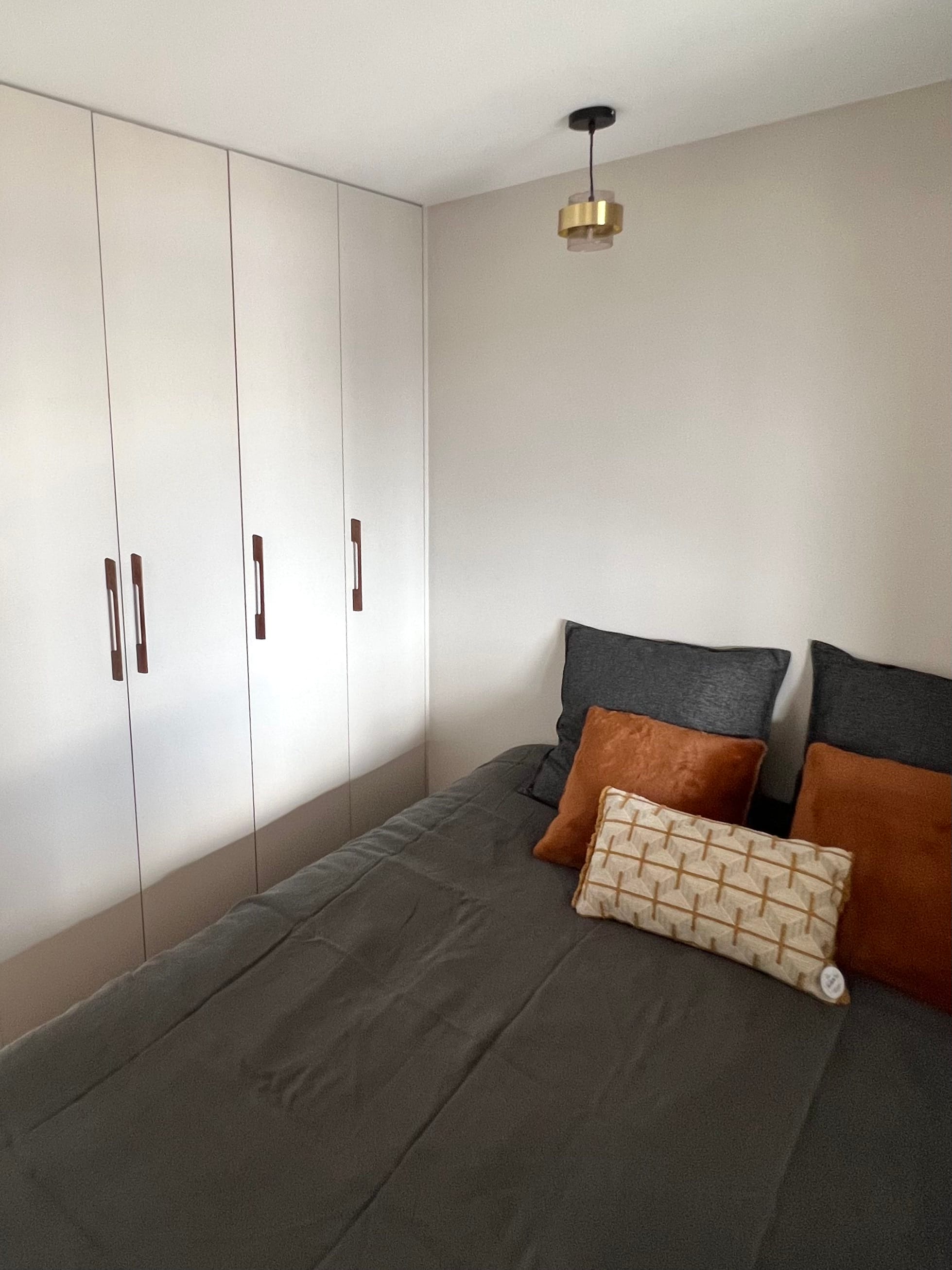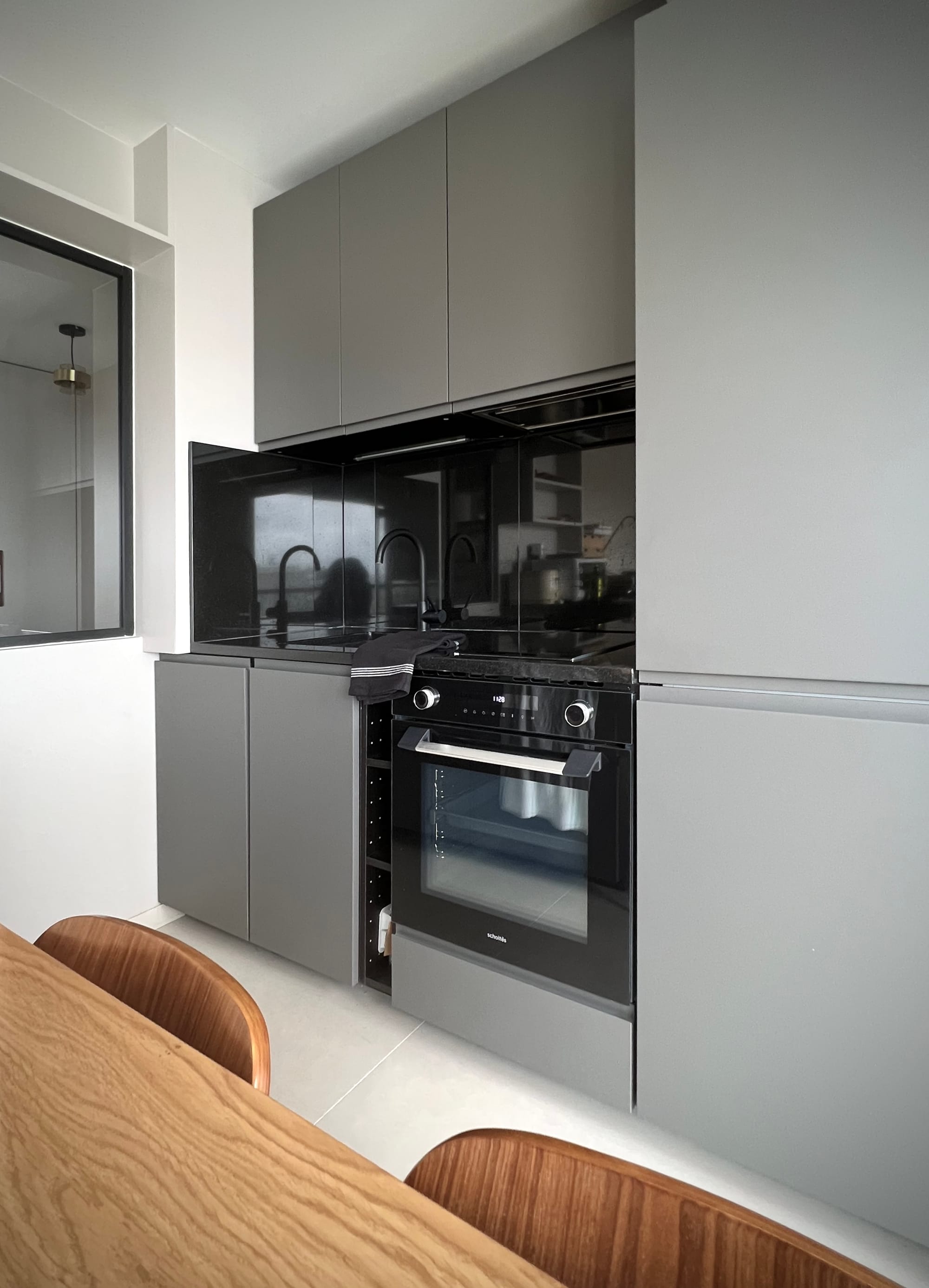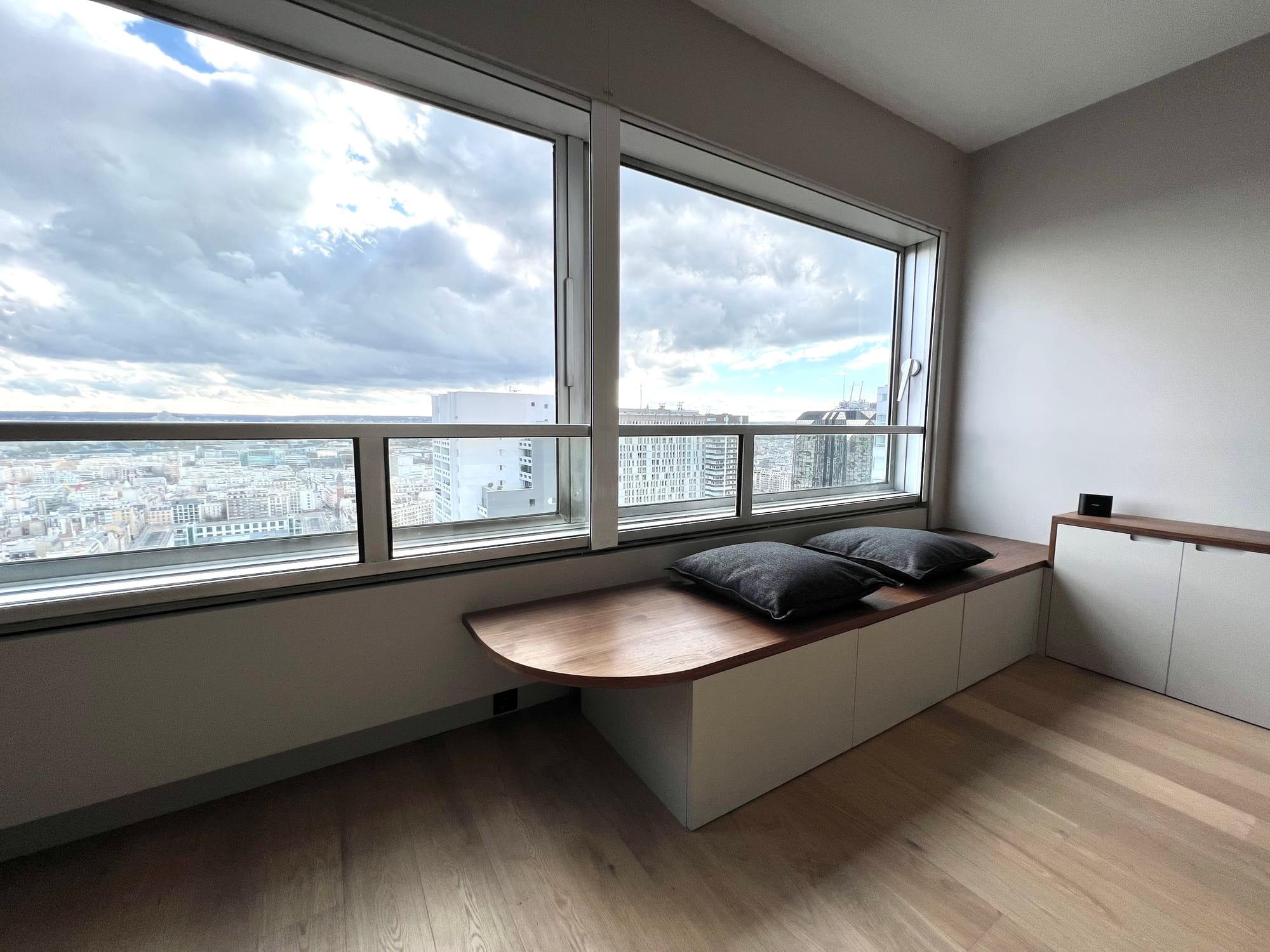 The apartment was entirely restructured to incorporate a cabin-style bedroom, bespoke storage tailored to the client’s needs, and a series of custom-designed elements organising the different functions — kitchen, workspace, dining and living — without partitioning the space.The project involved a complete redesign of the studio to improve functionality and create a fully considered living space.